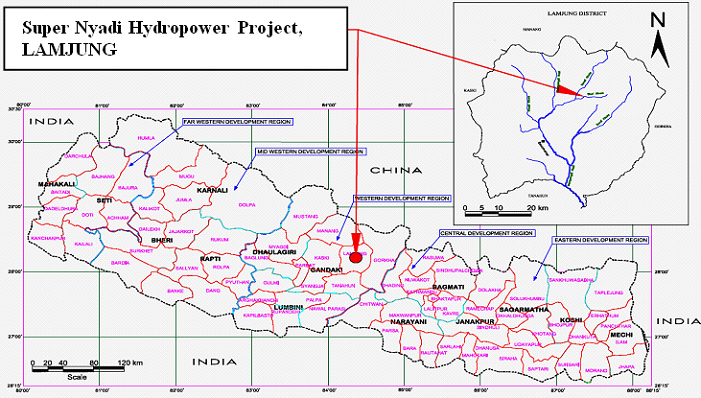 Super Nyadi Hydropower Project (40.27 MW) is located in Marsyangdi Gaupalika - 6, Lamjung district of Gandaki zone in Nepal. Nyadi Khola is a tributary of Marsyandgi Khola in Lamjung. Geographical coordinate of the project area is located between Longitudes 84030’18” E and 84026’57” E, Latitudes 28024’23” N and 28021’09” N.